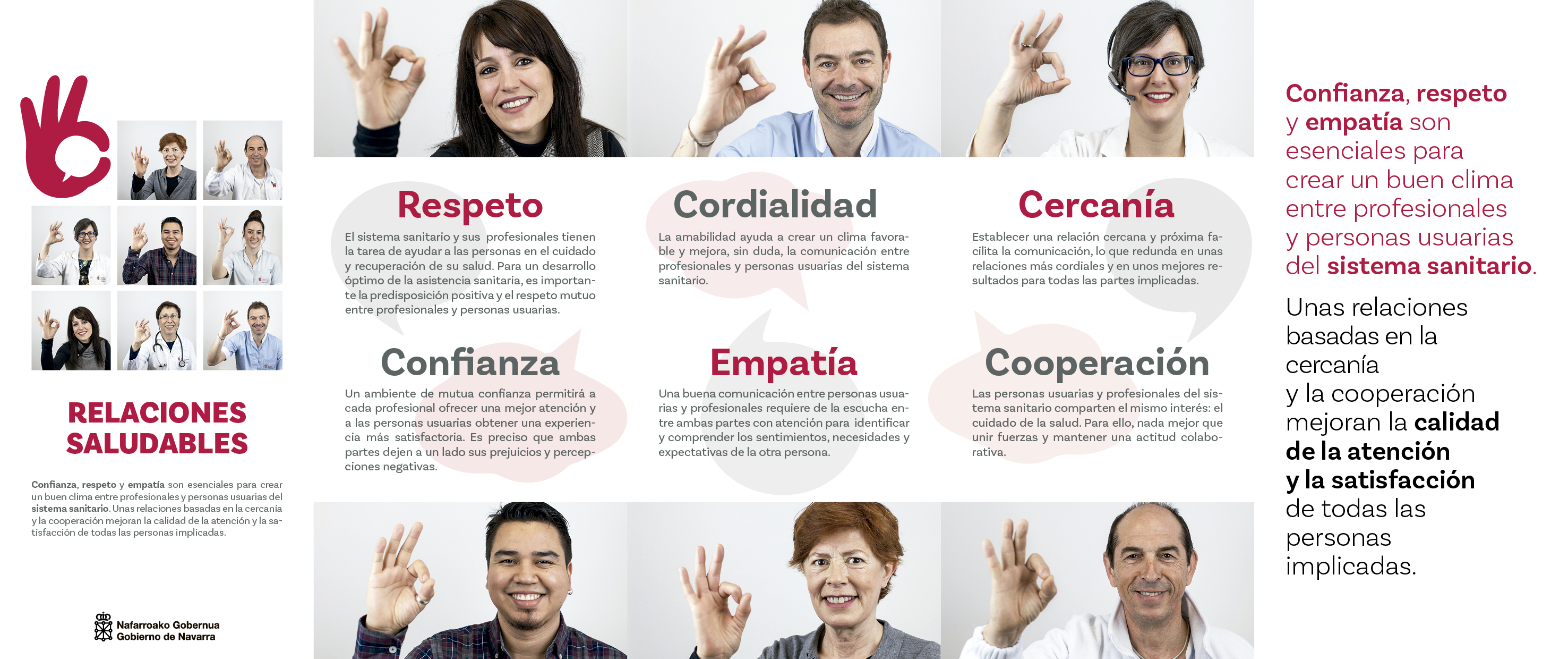El sistema sanitario y sus profesionales tienen la tarea de ayudar a las personas en el cuidado y recuperación de su salud. Para un desarrollo óptimo de la asistencia sanitaria, es importante la predisposición positiva y el respeto mutuo entre profesionales y personas usuarias. Unas relaciones basadas en la cercanía y la cooperación mejoran la calidad de la atención y la satisfacción de todas las personas implicadas. Confianza, respeto y empatía son esenciales para crear un buen clima.