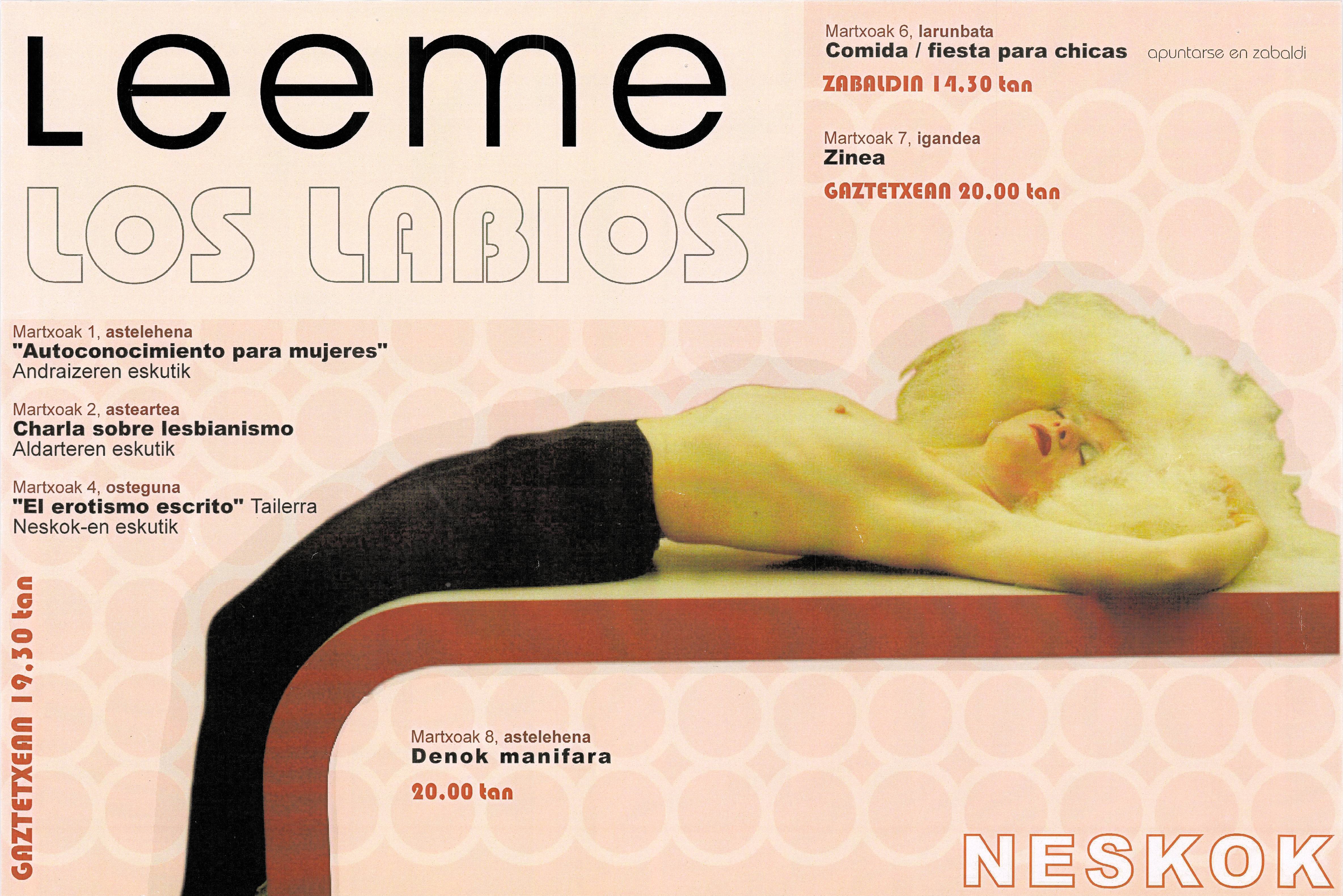 Cartel del grupo feminista pamplonés Neskok, creado en los años 90, con motivo del día internacional de la mujer. Bajo el título Leeme (sin tilde) los labios, el cartel muestra las actividades que se celebran en el Gaztetxe de Pamplona a las 19:30 (en el Euskal Jai, desalojado en 2004): lunes 1 de marzo, "Autoconocimiento para mujeres", de la mano de Andraize; martes 2, charla sobre lesbianismo de la mano de Aldarte; jueves 4, taller sobre "El erotismo escrito", de la mano de Neskok; 6 de marzo, comida y fiesta solo para chicas, 7 de marzo, cine en el Gaztetxe, y 8 de marzo, manifestación a las 20:00 horas.
