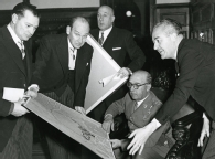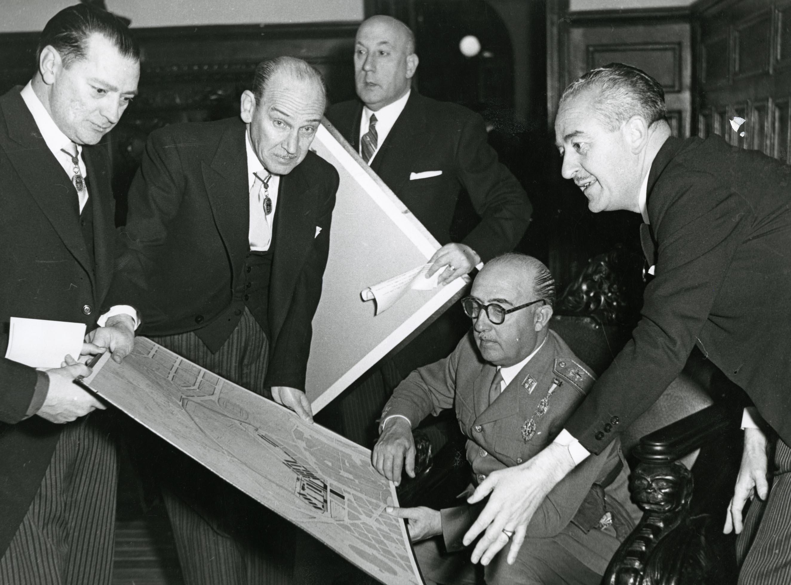 Detalle del encuentro mantenido por el jefe del Estado, general Franco, con el alcalde y representantes de la corporación municipal de Pamplona en la Casa Consistorial durante su viaje a Navarra. En el centro, sentado, el general Francisco Franco Bahamonde. A su alrededor, de izquierda a derecha, el concejal Ángel Goicoechea Reclusa; Javier Pueyo Bonet, alcalde de Pamplona, que tiende un plano ante el general; Ignacio Sanz González, secretario municipal; y Eugenio Arraiza Vilella, teniente de alcalde.